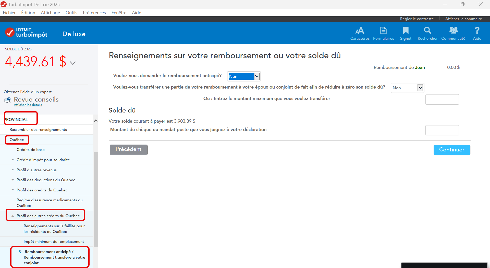 Si vous êtes résident du Québec et que vous utilisez TurboImpôt Bureau, vous êtes en mesure de faire ce transfert à partir de la section Provincial >> Québec >> Profil des autres crédits du Québec (vous devez sélectionner l'option Information sur votre remboursement)