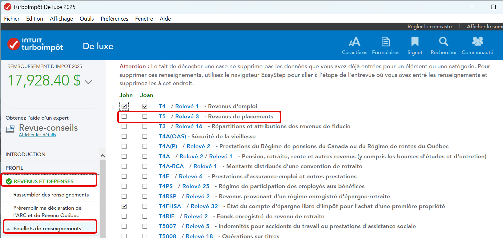 Si vous utilisez TurboImpôt Bureau, dans EasyStep, sélectionnez "Revenus et dépenses", "feuillets de renseignements", et choissiez "T5/Relevé 3. (voir capture d'écran qui suit)