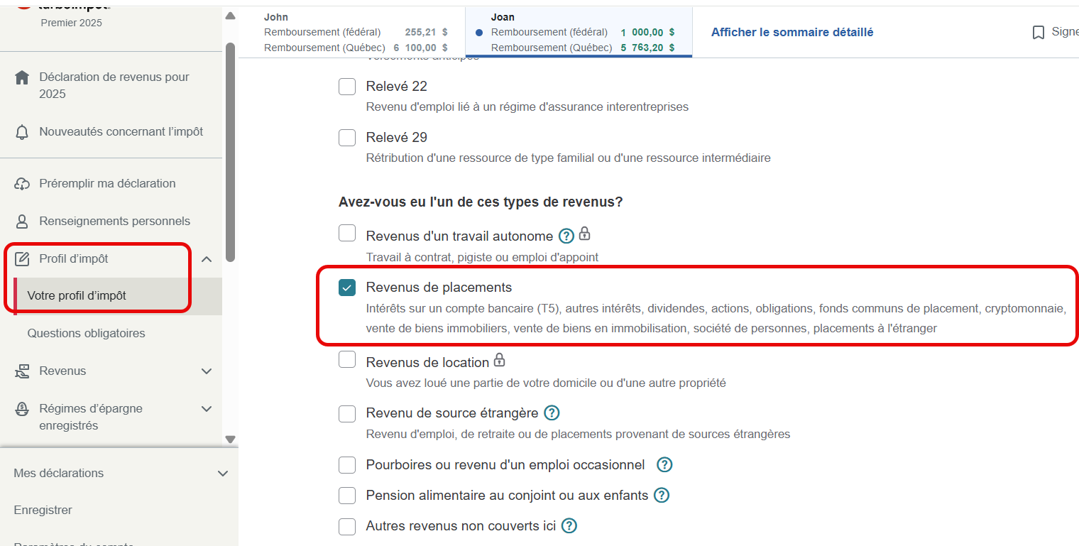 Si vous utilisez TurboImpôt Enligne, sélectionnez "Votre profil d'impôt" dans le menu de gauche, sur la première page, dans la section "Avez-vous eu l'un de ces types de revenus?", choisissez "Revenus de placements". (voir la capture d'écran qui suite)