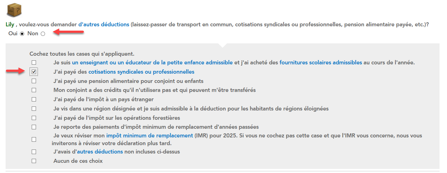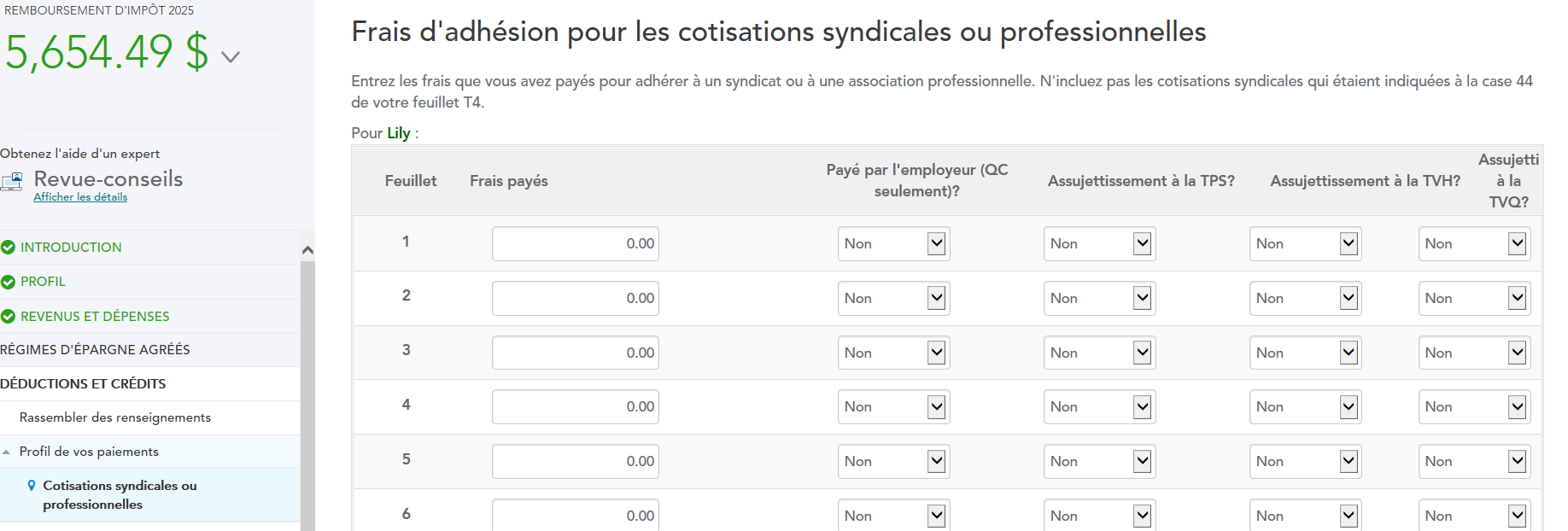 Dans Profil d'impôt, allez cocher que vous avez d'autres déductions. Ceci déclenchera la section pour entrer vos frais.