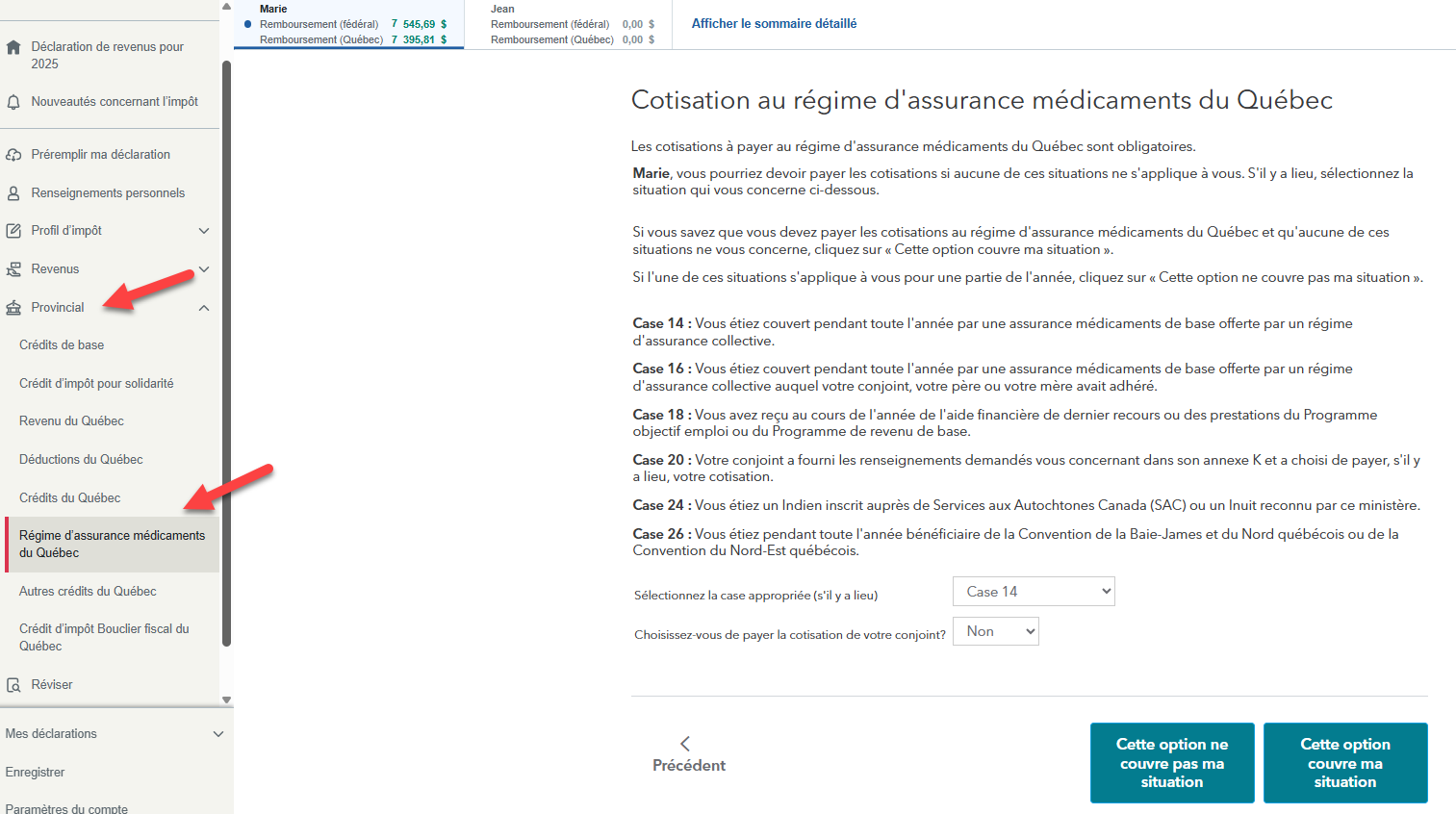 J'ai le même problème avec la version de luxe en ligne 2026 le soutien technique par téléphone n'a pas été capable de m'aider et me Réfère à la RAMQ complètement illogique ce que j'ai besoin de faire est de trouver comment décocher les cases qui ne devraient pas l'être ... les autres années j'utilisais la version PC et je n'ai jamais eu ce problème je regrette d'avoir fait le choix de la version en ligne