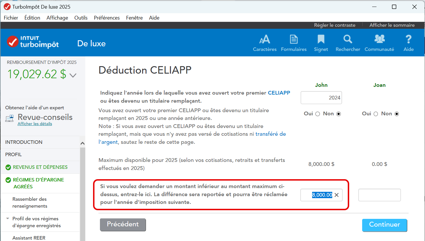 J'utilise TurboImpot 2025 (version desktop 20 declaration). J'ai ouvert mon CELIAPP en 2025 et mes cotisations sont de 8000 mais celles-ci ne sont pas prises en compte dans les deductions du federal bien que le feuillet T4FHSA soit rempli correctement avec le montant de 8000 a la ligne 18