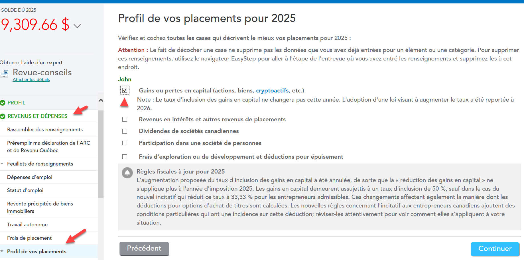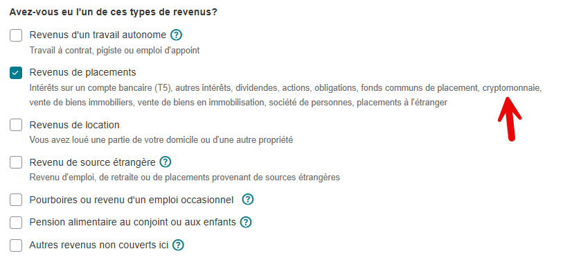 Lorsque vous commencer votre déclaration dans la section Profil, cochez que vous avez de Revenus de placement, et de crypto pour générer la section de gains en capital.