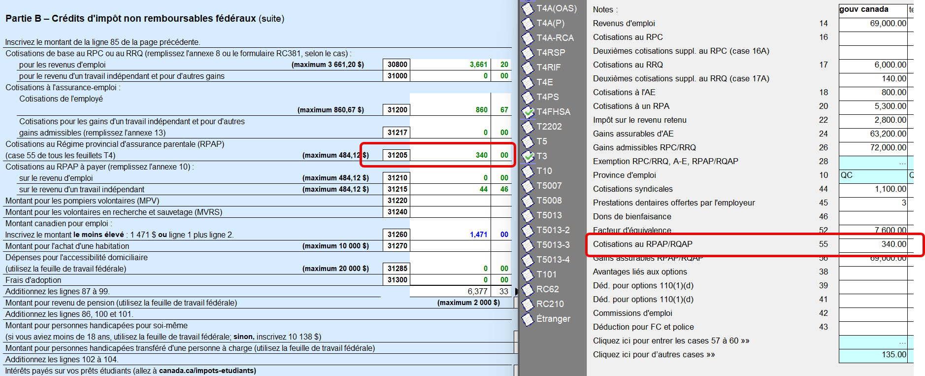 Pour la ligne 31205, nous avons fait quelques tests et le montant se rapporte. Nous vous suggérons de vous assurer que tous les renseignements de votre T4 soient correctement entrés.