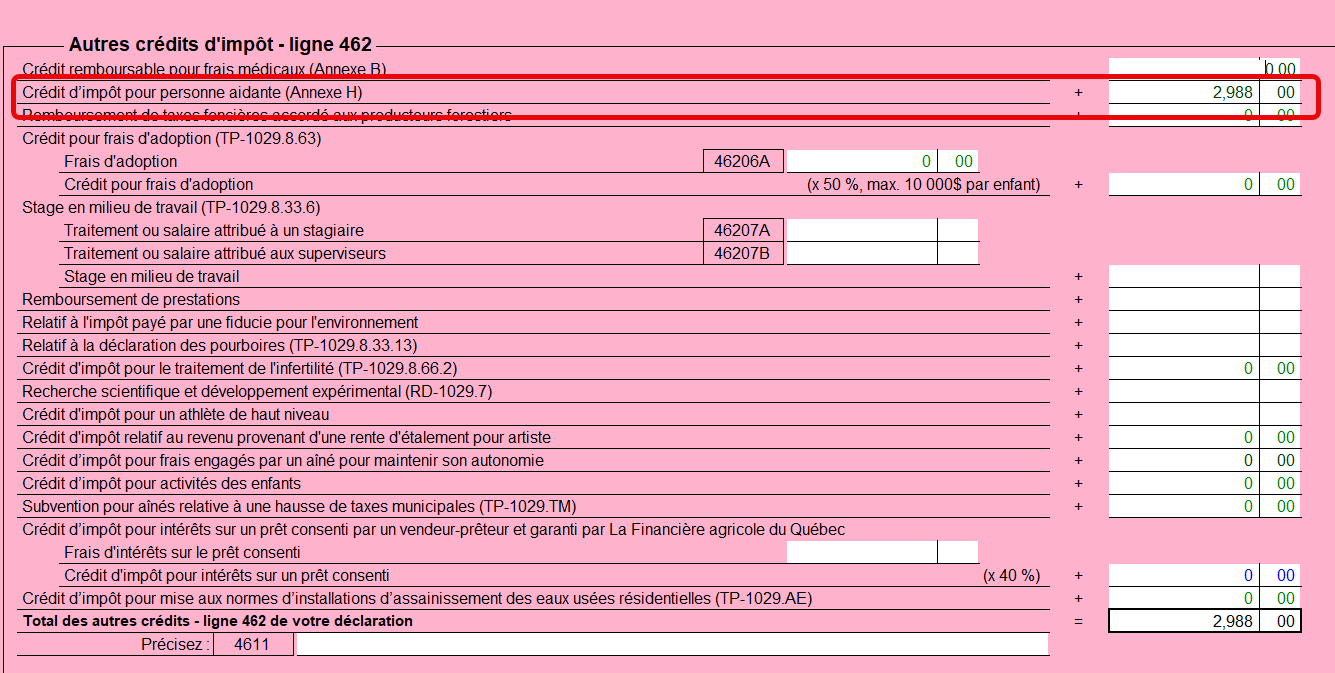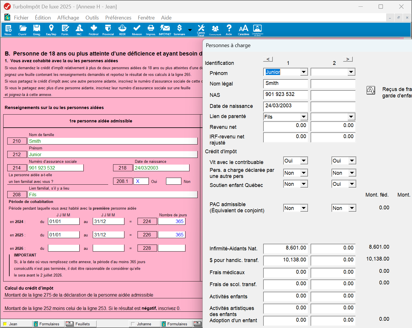 Les instructions ci-haut mentionnées fonctionnent aussi pour l'Annexe H - personne à charge adulte autre que conjoint. La seule différence est que vous devez entrer les renseignements de celle-ci dans la section "personne à charge". Une fois les étapes complétées, vous devriez voir, sur l'Annexe H, la personne aidée.