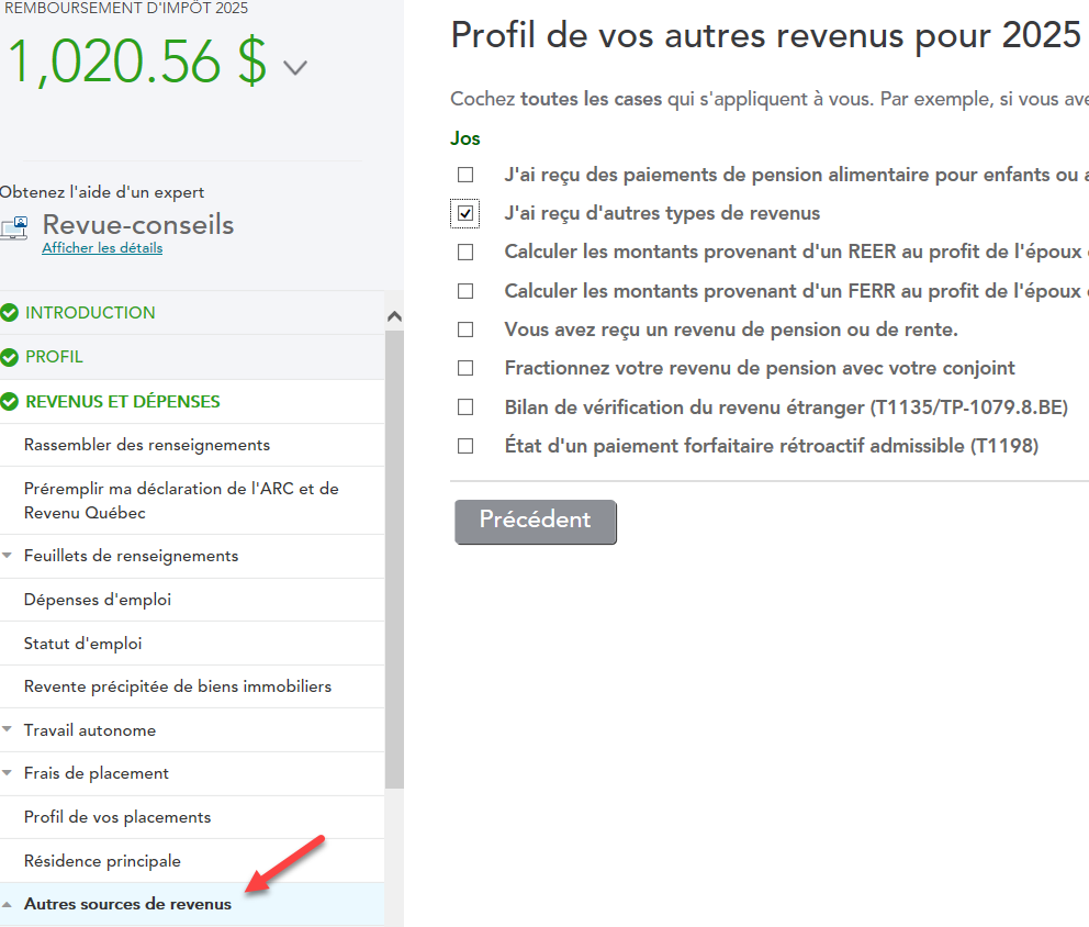 Dans TurboImpôt Bureau, cliquez sur Revenus et Dépenses dans le menu de gauche. Cliquez Autres sources de revenus et cochez j'ai re^cu d'autres types de revenus.