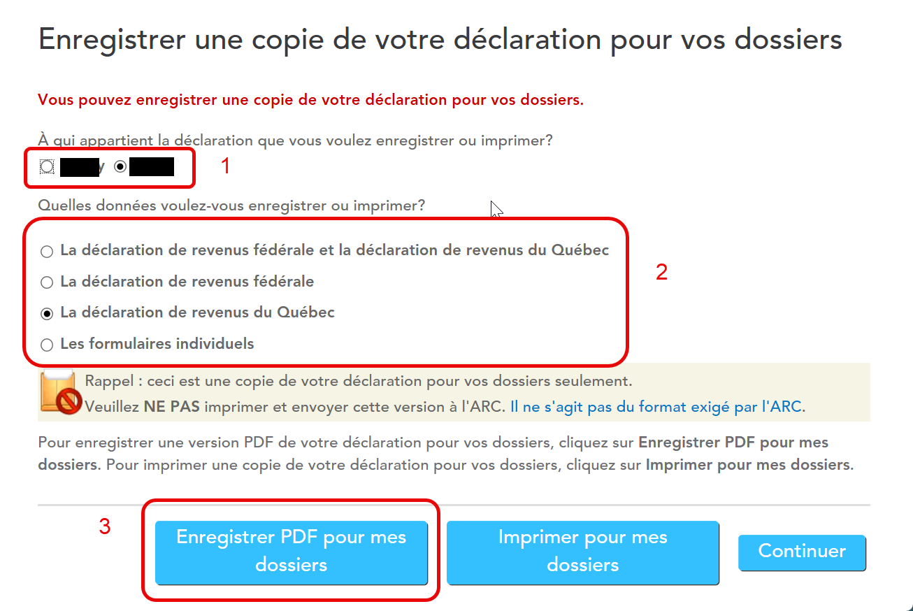Pour TurboImpôt Bureau, il est prééférable de télécharger le document .PDF de la déclaration à partir de l'icône d'imprimante, dans la barre d'outils bleue, en haut (voir les étapes dans la captures d'écran qui suit).