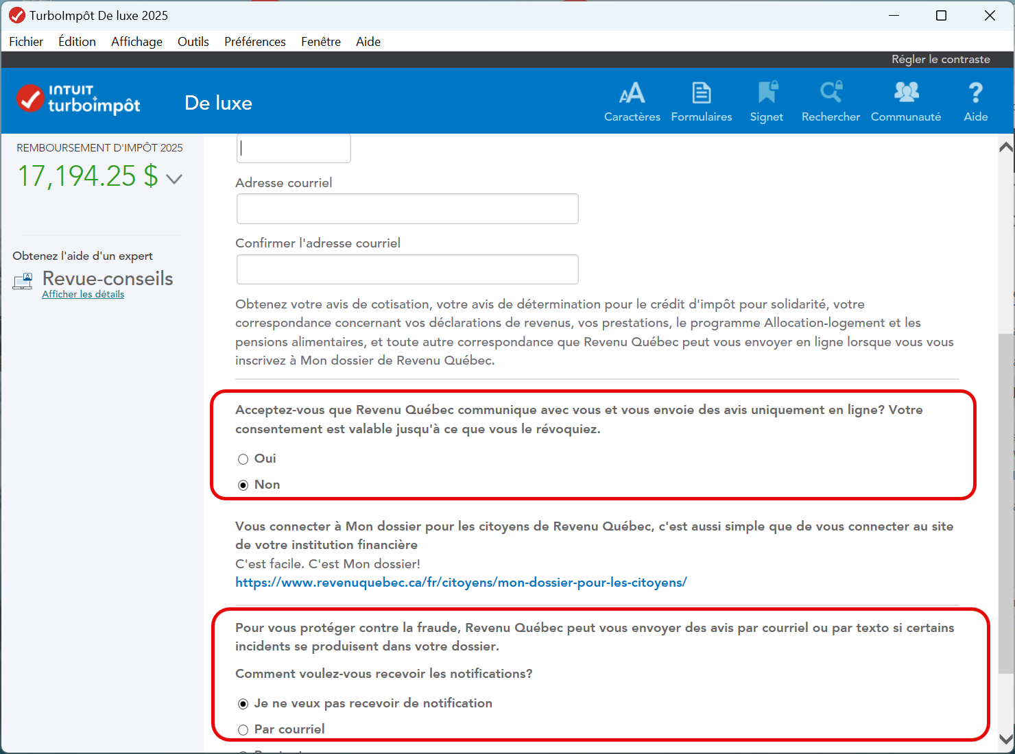 Lorsque vous cliquez pour IMPÔTNET Revenu Québec, à l'une des pages avant l'envoi, vous devez répondre si vous désirez recevoir votre avis de cotisation ou correspondance par courriel (ou recevoir un avis par courriel). Si vous avez répondu OUI à l'une de ces questions, le courriel devient alors requis pour pouvoir poursuivre (voir la capture d'écran qui suit)