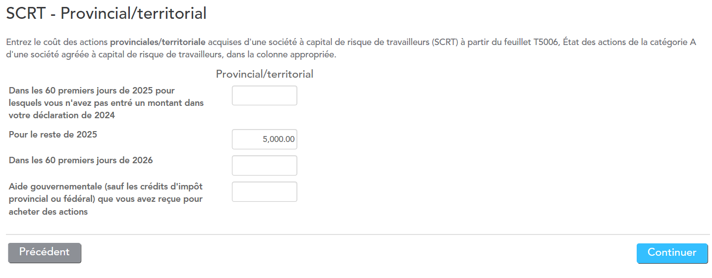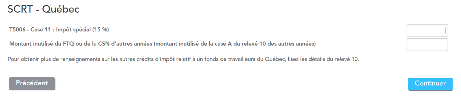 Il semble donc que le guide soit dans l'erreur et qu'on doive remplir cette section (SCRT - Provincial/territorial) même si on n'a PAS reçu de T5006. Ce serait la façon EasyStep de remplir la partie du haut de la "Grille de calcul relatif à un fond de travailleurs", laquelle est nécessaire pour obtenir la déduction au fédéral.