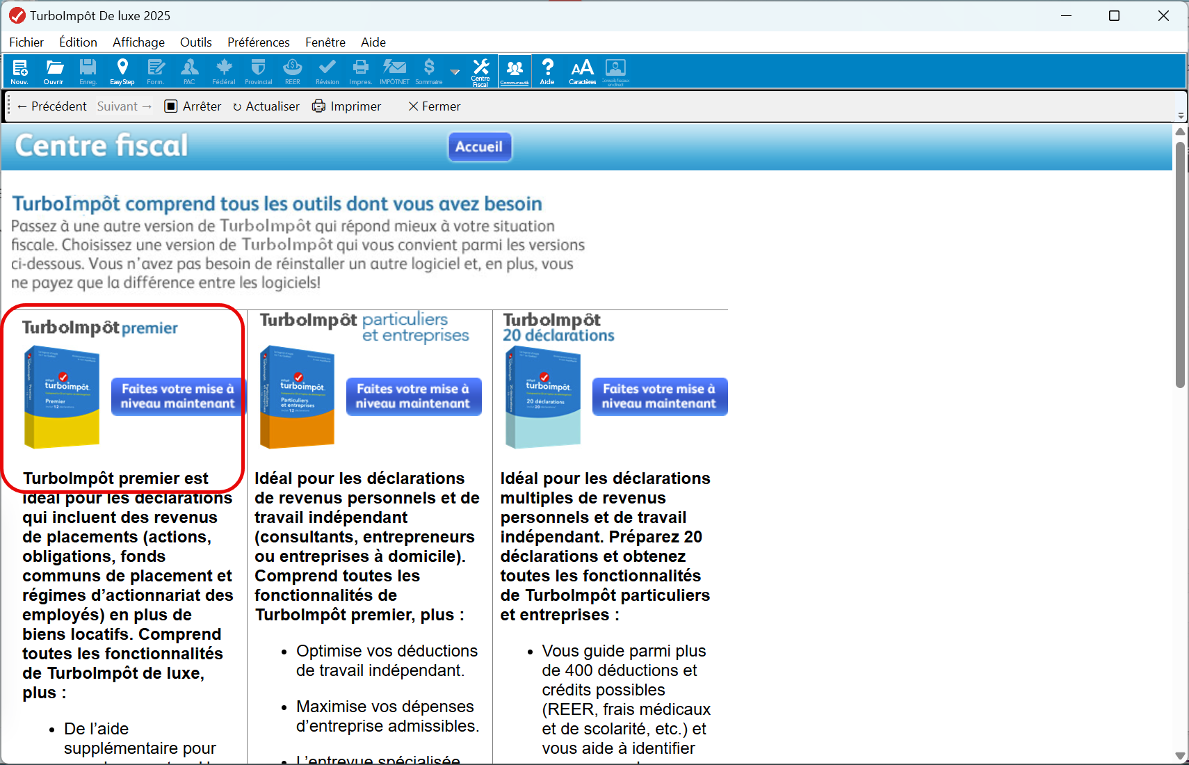 j'ai acheter le logiciel de luxe au costco comme a chaque année et j'ai commencer a l'utiliser mais j'ai réalisé que cette année je devais acheter la version Premier a cause de transfert dans des ferr/reer. j'ai donc acheté en ligne la version Premier mais lorsque je le downloade et je l'ouvre c'est la version de luxe qui est sur mon ordi. quoi faire?