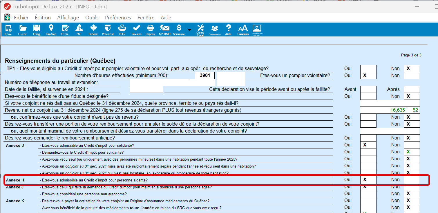 1- Aller dans le formulaire INFO de la personne qui demande le crédit (vous), dans la section des renseignements du particulier (Qc) – page 3, assurez-vous qu’il y a un "X" à OUI de l’ANNEXE H. NOTE: assurez-vous que cette question est à "NON" pour la personne aidée (votre conjoint)