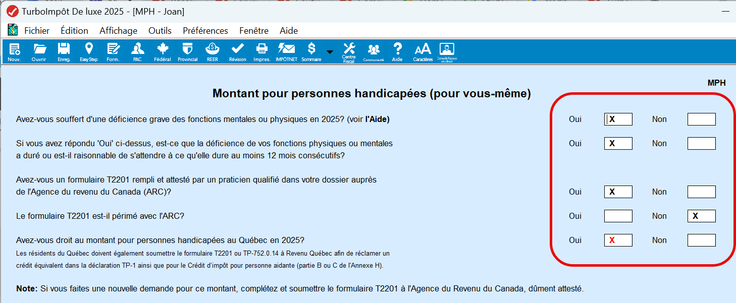 2- Vu que l’aidant est le conjoint, vérifiez le formulaire MPH. Le demandeur (vous) doit avoir NON à TOUTES les questions et la personne handicapée (votre conjoint) doit avoir OUI à TOUTES les questions (sauf pour la question qui demande si le formulaire T2201 est périmé avec l'ARC)