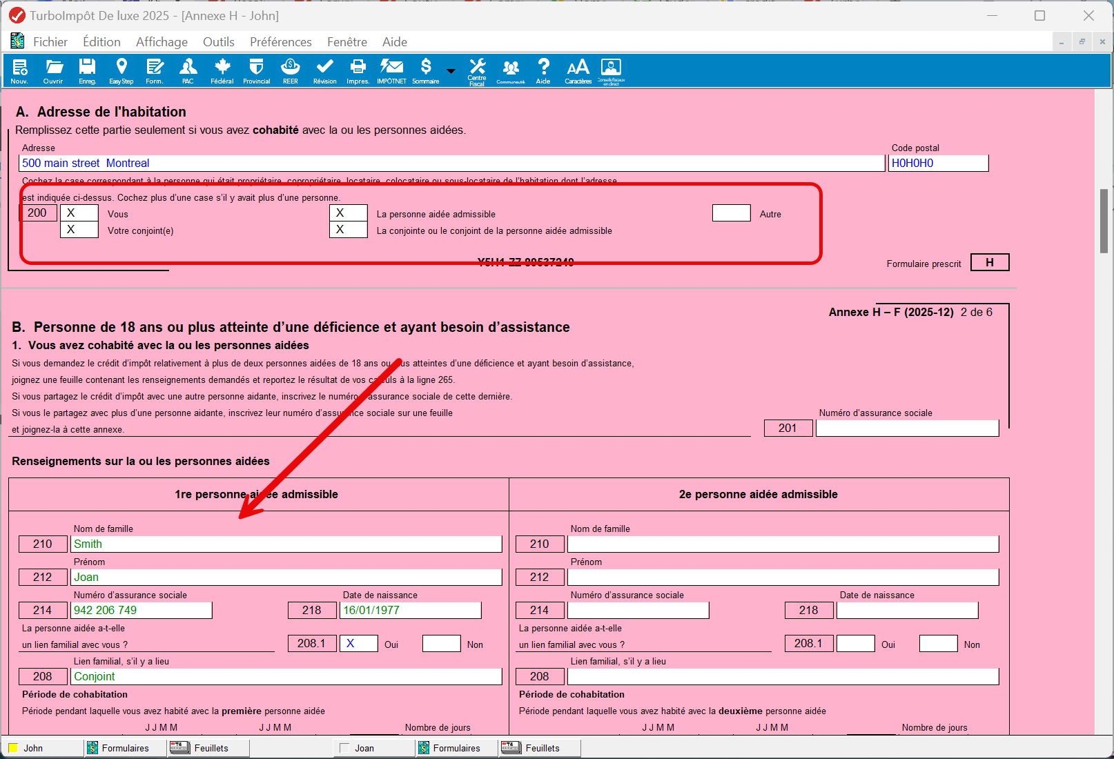 Note: Veuillez vous assurer de NE PAS mettre le conjoint dans la section des personnes à charge. Vous ne pouvez pas mettre un conjoint sous les personnes à charge. Il est préférable de faire une déclaration conjointe pour pouvoir appliquer le crédit personne aidante de l'Annexe H correctement.