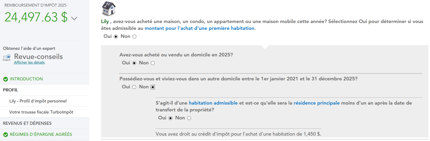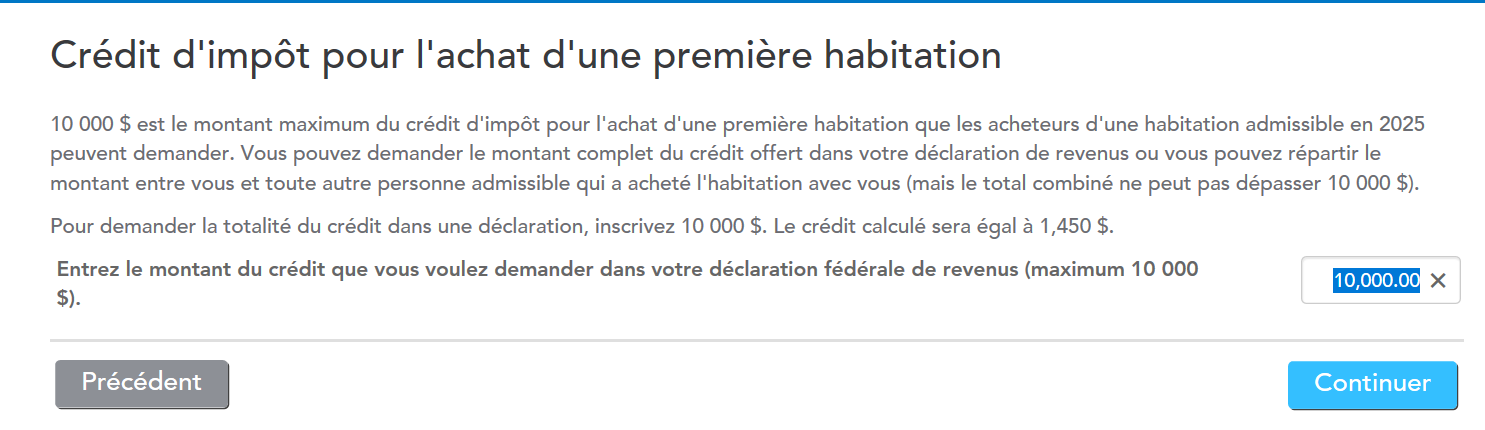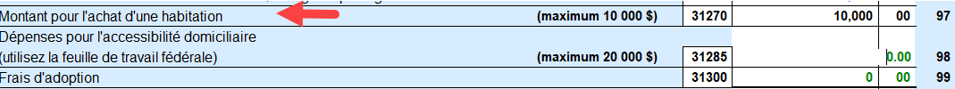 Continuez de remplir la déclaration jusqu'à la section Déductions et crédits - Profil de vos paiements. Sur cette page cochez la case Montant pour l'achat d'une première habitation