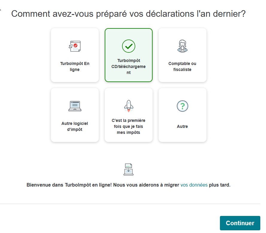 Ouvrez TurboImpôt en ligne. Au tout début de l'entrevue indiquez comment vous avez fait vos déclarations l'an dernier.