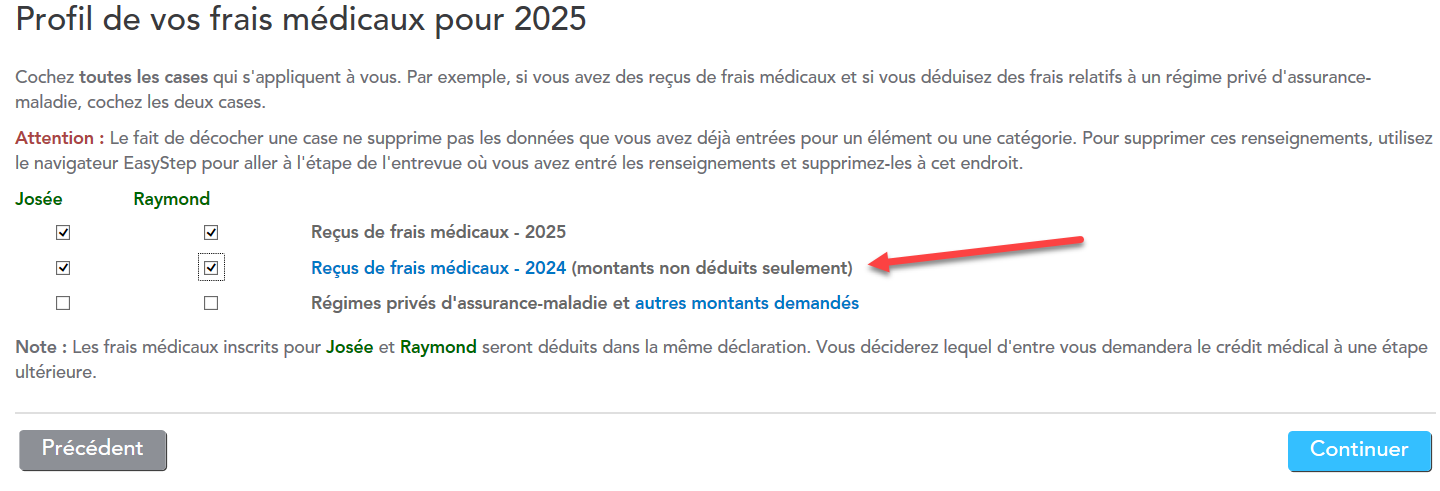 Sous Déductions et Crédits - Profil des frais médicaux dans le menu de gauche. Lorsque vous cochez que vous avez des reçus de 2024 non déduit.
