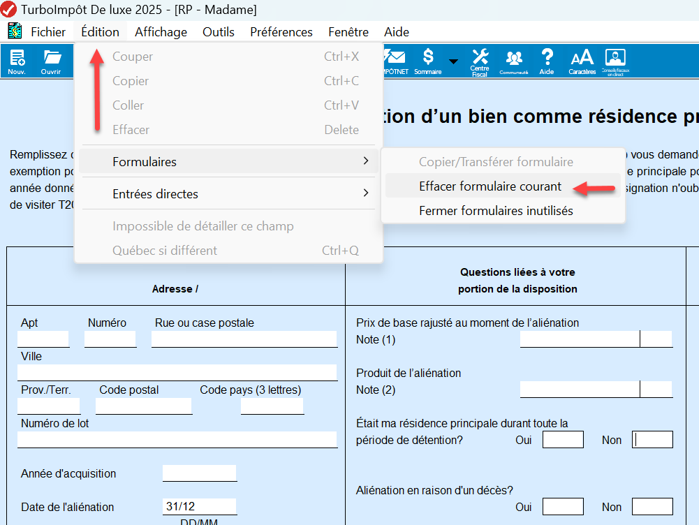 Allez en mode formulaires, cliquez Édition - Formulaires - Effacer formulaire courant. Enregistrez votre déclaration. Entrez de nouveau les informations sur la vente de votre résidence principale. Vous pouvez le faire en mode formulaire ou e mode EasyStep.